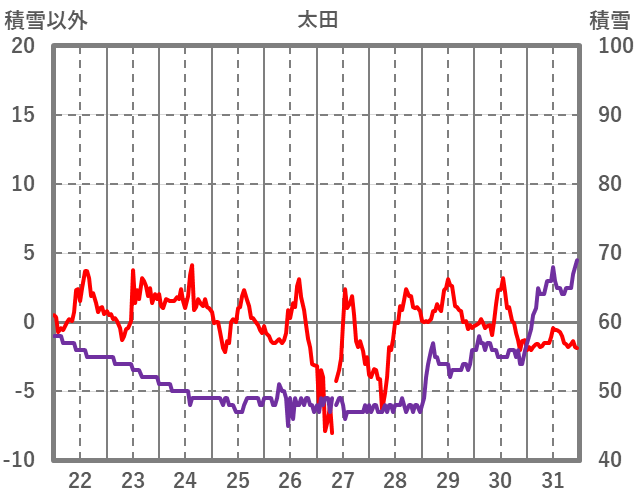 | 日 | 時 | 気温 | 降水 | 風向/風速 | 日照 | 積雪 | 降雪 |