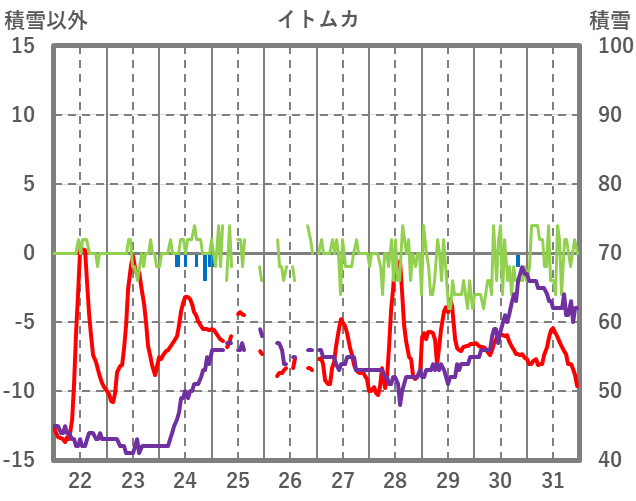| 日 | 時 | 気温 | 降水 | 風向/風速 | 日照 | 積雪 | 降雪 |