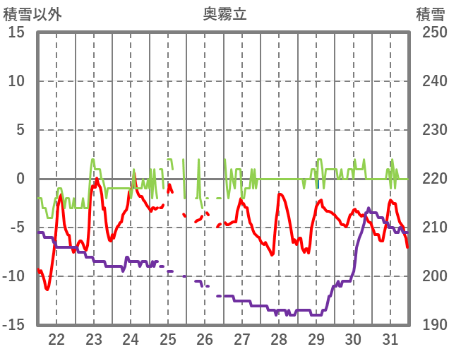 | 日 | 時 | 気温 | 降水 | 風向/風速 | 日照 | 積雪 | 降雪 |
