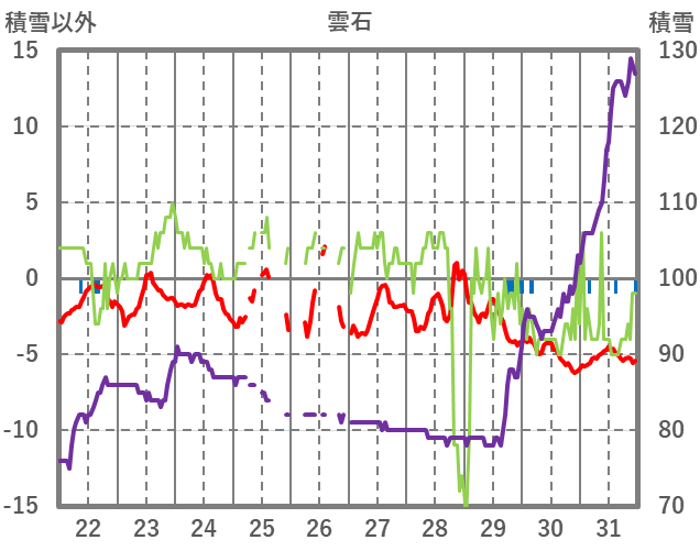 | 日 | 時 | 気温 | 降水 | 風向/風速 | 日照 | 積雪 | 降雪 |