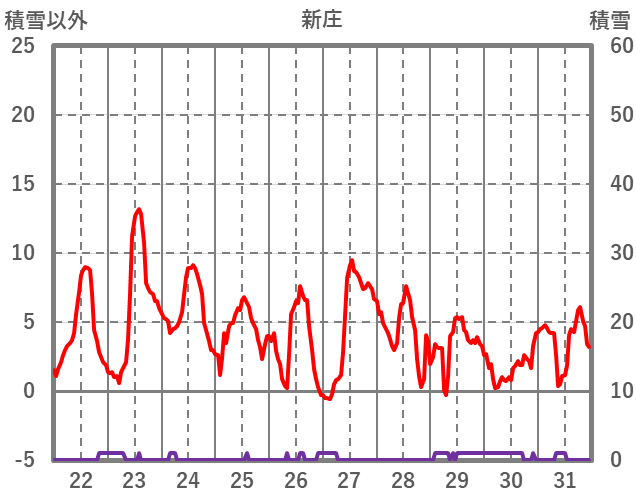 | 日 | 時 | 気温 | 降水 | 風向/風速 | 日照 | 積雪 | 降雪 |