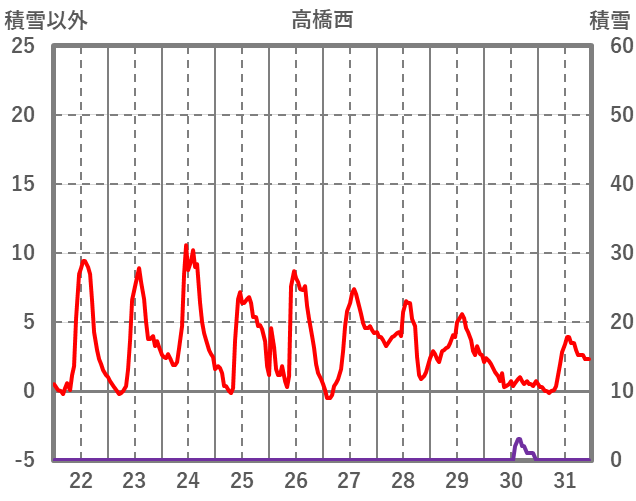 | 日 | 時 | 気温 | 降水 | 風向/風速 | 日照 | 積雪 | 降雪 |