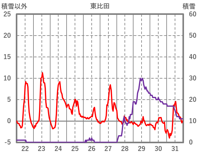 | 日 | 時 | 気温 | 降水 | 風向/風速 | 日照 | 積雪 | 降雪 |