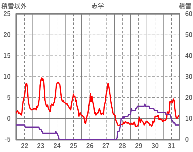 | 日 | 時 | 気温 | 降水 | 風向/風速 | 日照 | 積雪 | 降雪 |