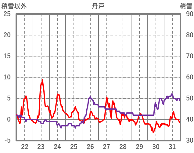 | 日 | 時 | 気温 | 降水 | 風向/風速 | 日照 | 積雪 | 降雪 |
