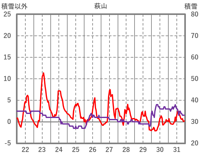 | 日 | 時 | 気温 | 降水 | 風向/風速 | 日照 | 積雪 | 降雪 |