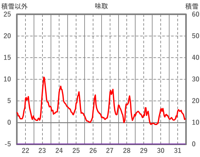 | 日 | 時 | 気温 | 降水 | 風向/風速 | 日照 | 積雪 | 降雪 |
