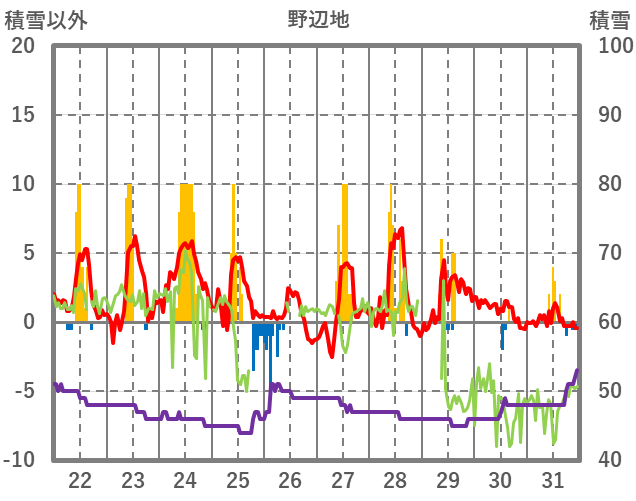 | 日 | 時 | 気温 | 降水 | 風向/風速 | 日照 | 積雪 | 降雪 |