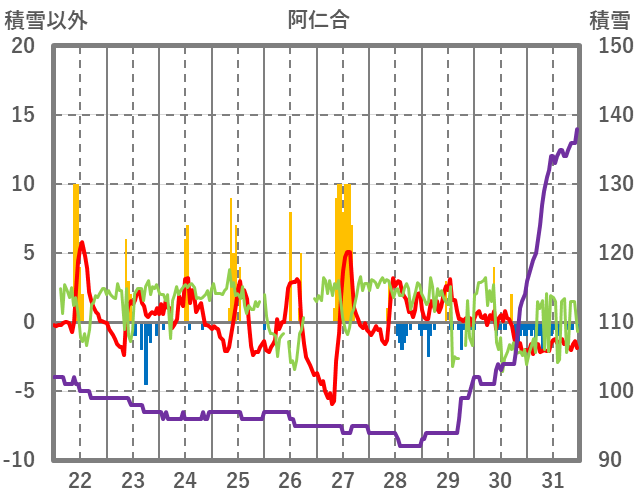 | 日 | 時 | 気温 | 降水 | 風向/風速 | 日照 | 積雪 | 降雪 |