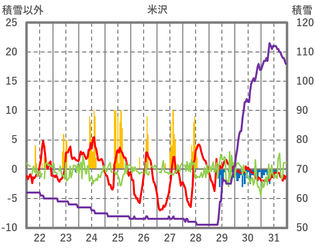 | 日 | 時 | 気温 | 降水 | 風向/風速 | 日照 | 積雪 | 降雪 |