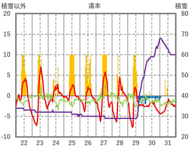 | 日 | 時 | 気温 | 降水 | 風向/風速 | 日照 | 積雪 | 降雪 |