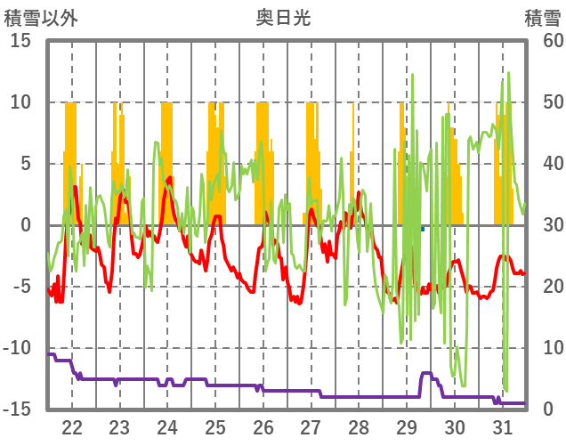 | 日 | 時 | 気温 | 降水 | 風向/風速 | 日照 | 積雪 | 降雪 |