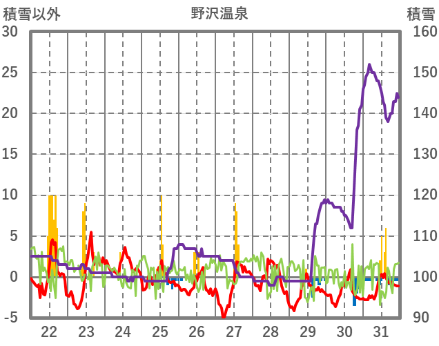 | 日 | 時 | 気温 | 降水 | 風向/風速 | 日照 | 積雪 | 降雪 |