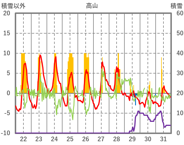 | 日 | 時 | 気温 | 降水 | 風向/風速 | 日照 | 積雪 | 降雪 |