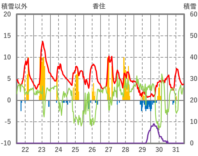 | 日 | 時 | 気温 | 降水 | 風向/風速 | 日照 | 積雪 | 降雪 |