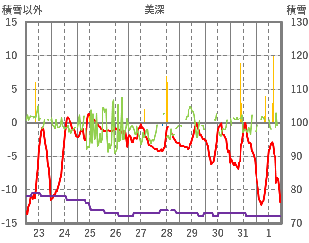 | 日 | 時 | 気温 | 降水 | 風向/風速 | 日照 | 積雪 | 降雪 |