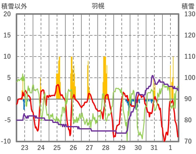 | 日 | 時 | 気温 | 降水 | 風向/風速 | 日照 | 積雪 | 降雪 |