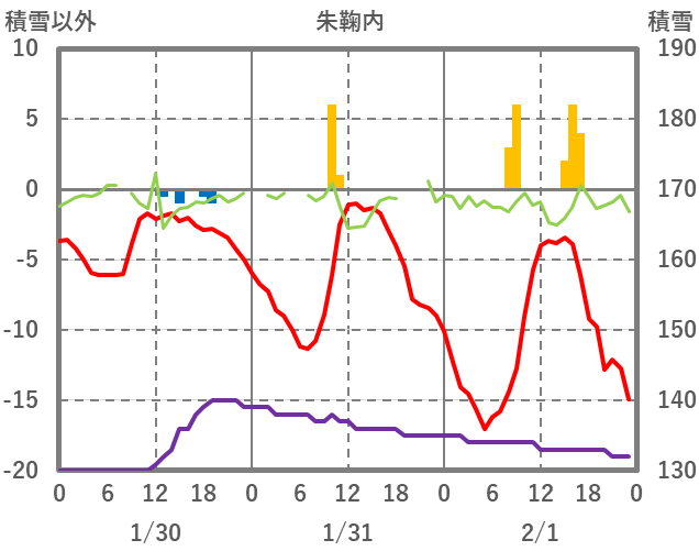 | 日 | 時 | 気温 | 降水 | 風向/風速 | 日照 | 積雪 | 降雪 |