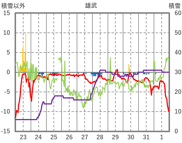 | 日 | 時 | 気温 | 降水 | 風向/風速 | 日照 | 積雪 | 降雪 |