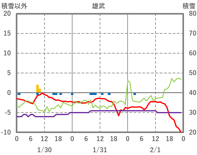 | 日 | 時 | 気温 | 降水 | 風向/風速 | 日照 | 積雪 | 降雪 |