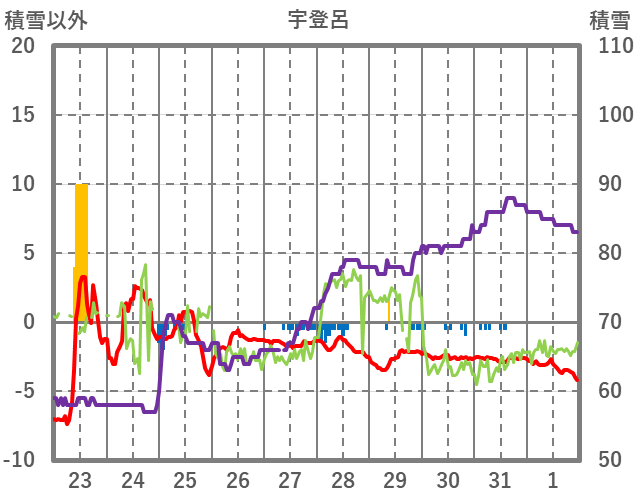 | 日 | 時 | 気温 | 降水 | 風向/風速 | 日照 | 積雪 | 降雪 |