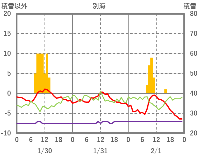 | 日 | 時 | 気温 | 降水 | 風向/風速 | 日照 | 積雪 | 降雪 |