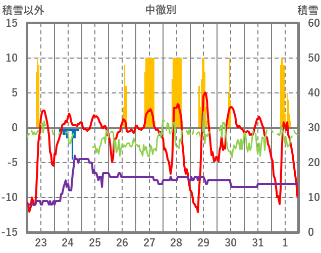 | 日 | 時 | 気温 | 降水 | 風向/風速 | 日照 | 積雪 | 降雪 |