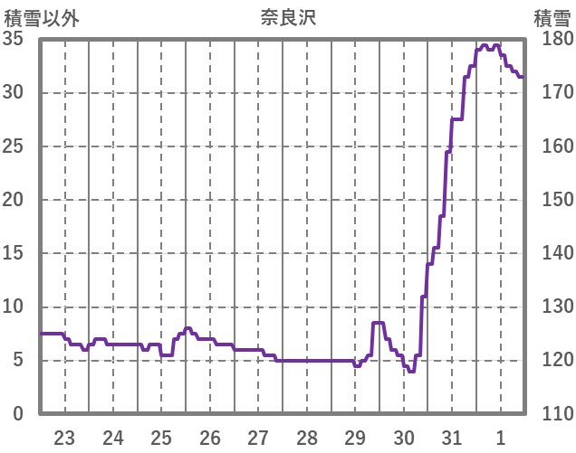 | 日 | 時 | 気温 | 降水 | 風向/風速 | 日照 | 積雪 | 降雪 |