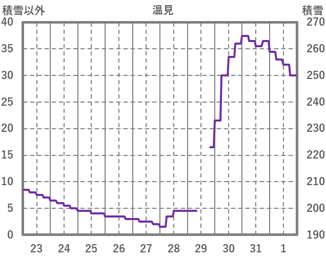 | 日 | 時 | 気温 | 降水 | 風向/風速 | 日照 | 積雪 | 降雪 |