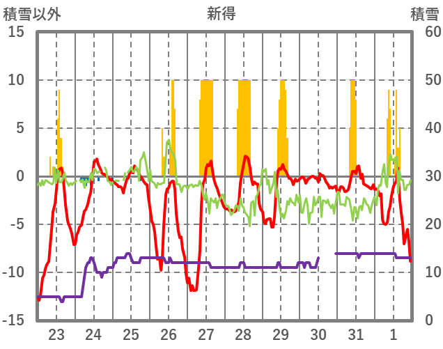 | 日 | 時 | 気温 | 降水 | 風向/風速 | 日照 | 積雪 | 降雪 |