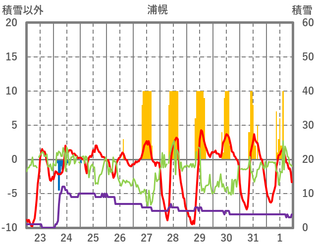 | 日 | 時 | 気温 | 降水 | 風向/風速 | 日照 | 積雪 | 降雪 |
