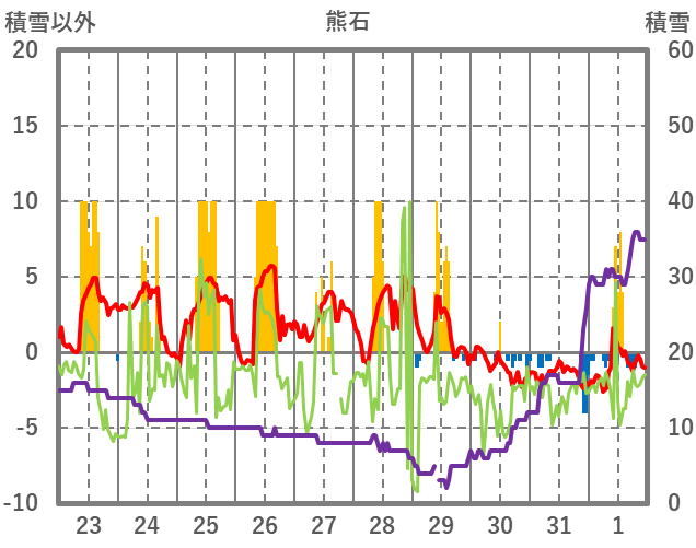 | 日 | 時 | 気温 | 降水 | 風向/風速 | 日照 | 積雪 | 降雪 |