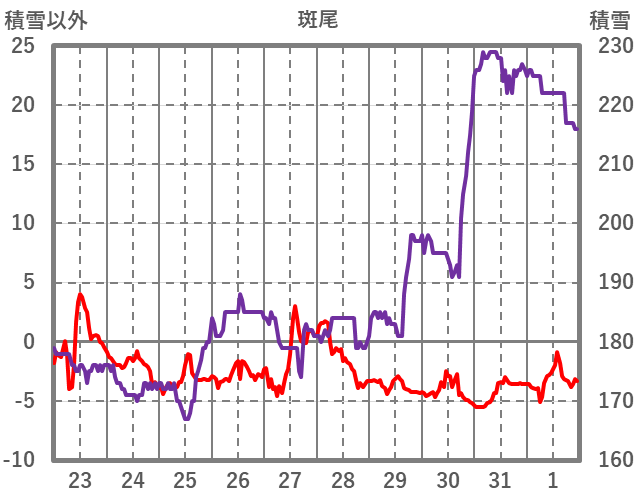 | 日 | 時 | 気温 | 降水 | 風向/風速 | 日照 | 積雪 | 降雪 |