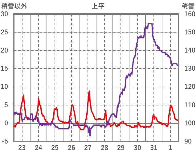 | 日 | 時 | 気温 | 降水 | 風向/風速 | 日照 | 積雪 | 降雪 |
