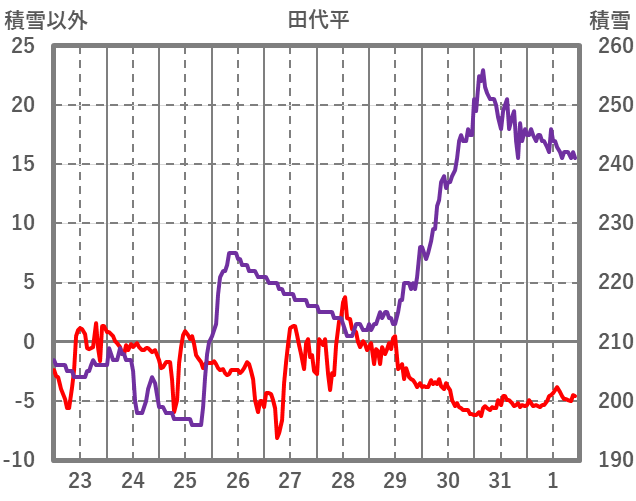 | 日 | 時 | 気温 | 降水 | 風向/風速 | 日照 | 積雪 | 降雪 |