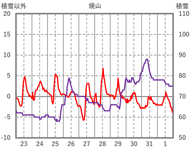 | 日 | 時 | 気温 | 降水 | 風向/風速 | 日照 | 積雪 | 降雪 |