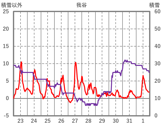 | 日 | 時 | 気温 | 降水 | 風向/風速 | 日照 | 積雪 | 降雪 |