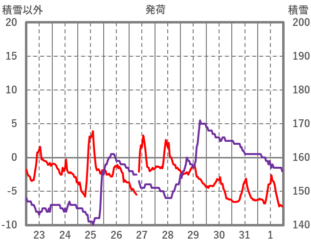 | 日 | 時 | 気温 | 降水 | 風向/風速 | 日照 | 積雪 | 降雪 |