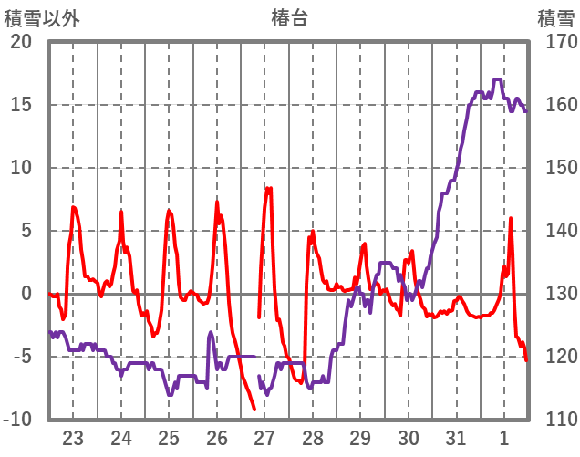 | 日 | 時 | 気温 | 降水 | 風向/風速 | 日照 | 積雪 | 降雪 |