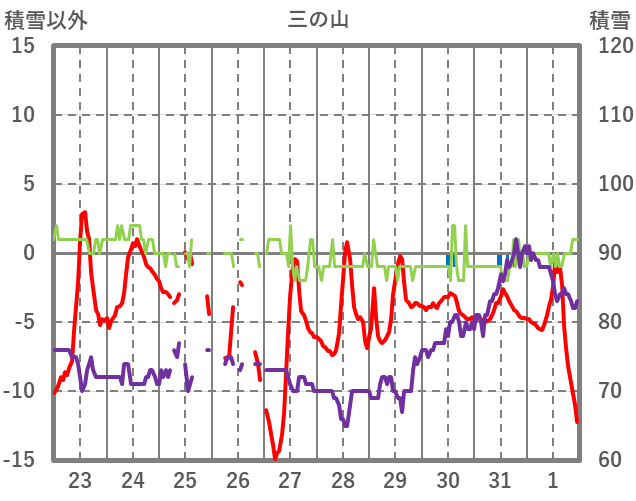 | 日 | 時 | 気温 | 降水 | 風向/風速 | 日照 | 積雪 | 降雪 |