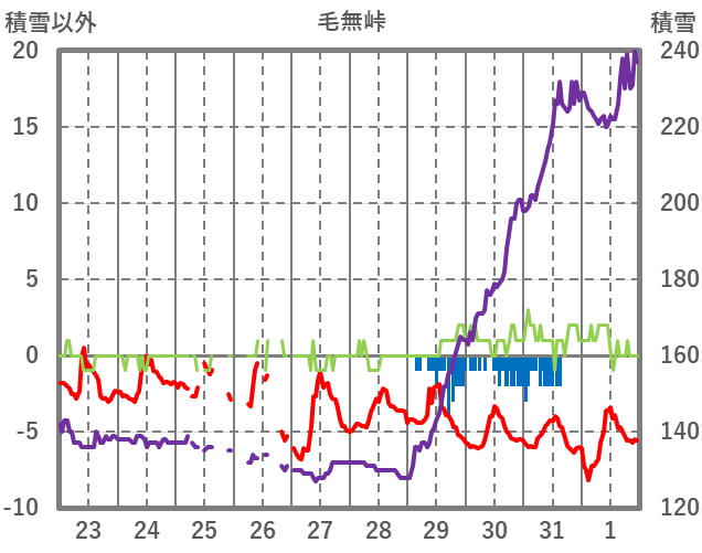 | 日 | 時 | 気温 | 降水 | 風向/風速 | 日照 | 積雪 | 降雪 |