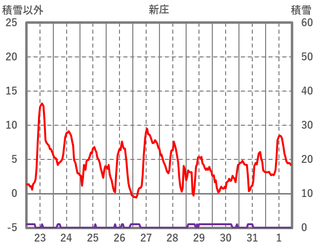 | 日 | 時 | 気温 | 降水 | 風向/風速 | 日照 | 積雪 | 降雪 |