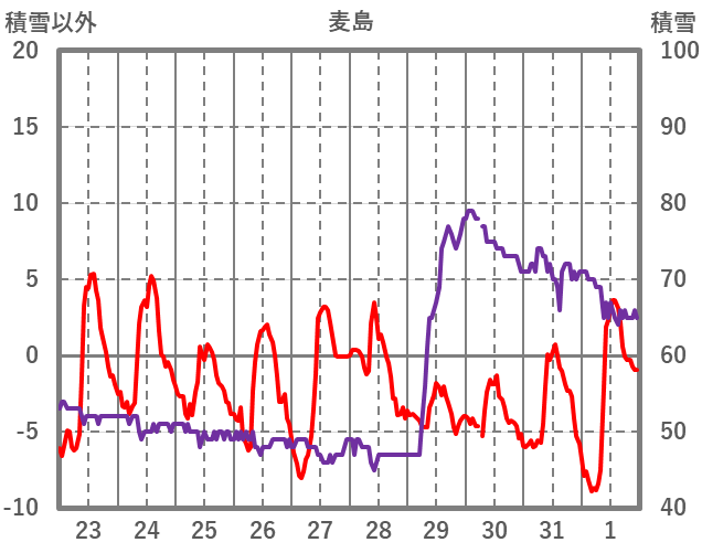 | 日 | 時 | 気温 | 降水 | 風向/風速 | 日照 | 積雪 | 降雪 |