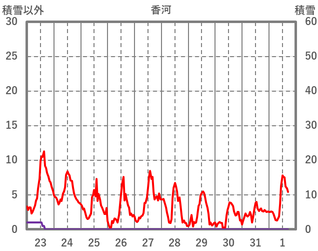 | 日 | 時 | 気温 | 降水 | 風向/風速 | 日照 | 積雪 | 降雪 |