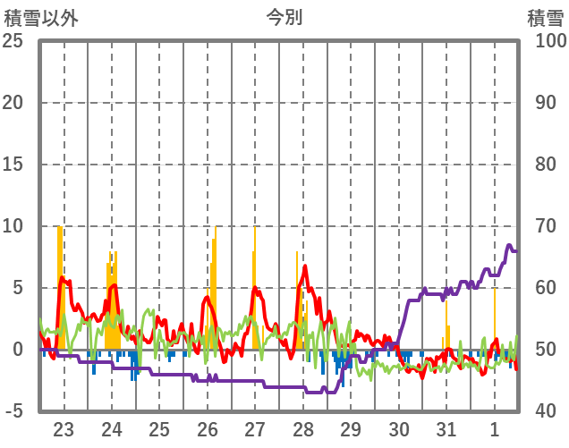 | 日 | 時 | 気温 | 降水 | 風向/風速 | 日照 | 積雪 | 降雪 |