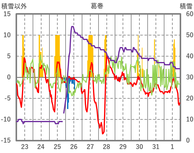 | 日 | 時 | 気温 | 降水 | 風向/風速 | 日照 | 積雪 | 降雪 |
