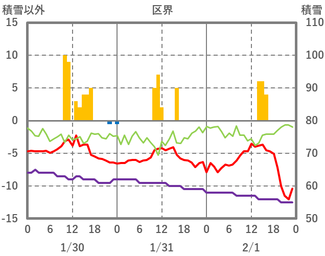 | 日 | 時 | 気温 | 降水 | 風向/風速 | 日照 | 積雪 | 降雪 |