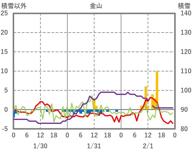 | 日 | 時 | 気温 | 降水 | 風向/風速 | 日照 | 積雪 | 降雪 |