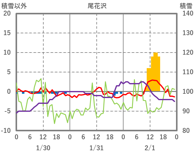 | 日 | 時 | 気温 | 降水 | 風向/風速 | 日照 | 積雪 | 降雪 |