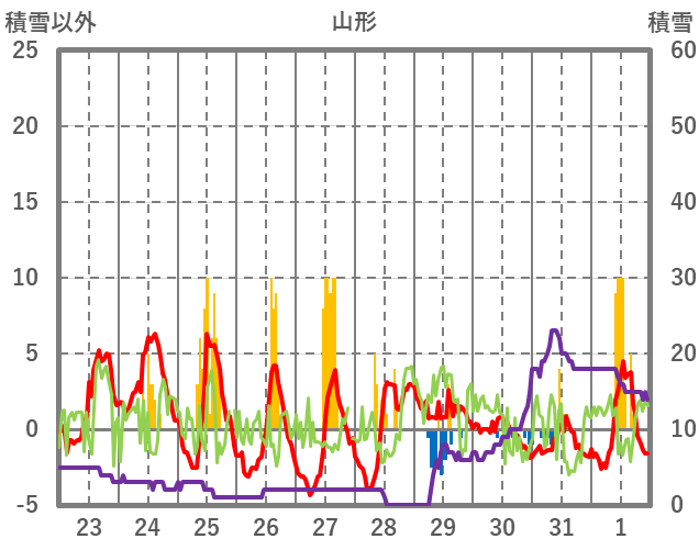| 日 | 時 | 気温 | 降水 | 風向/風速 | 日照 | 積雪 | 降雪 |